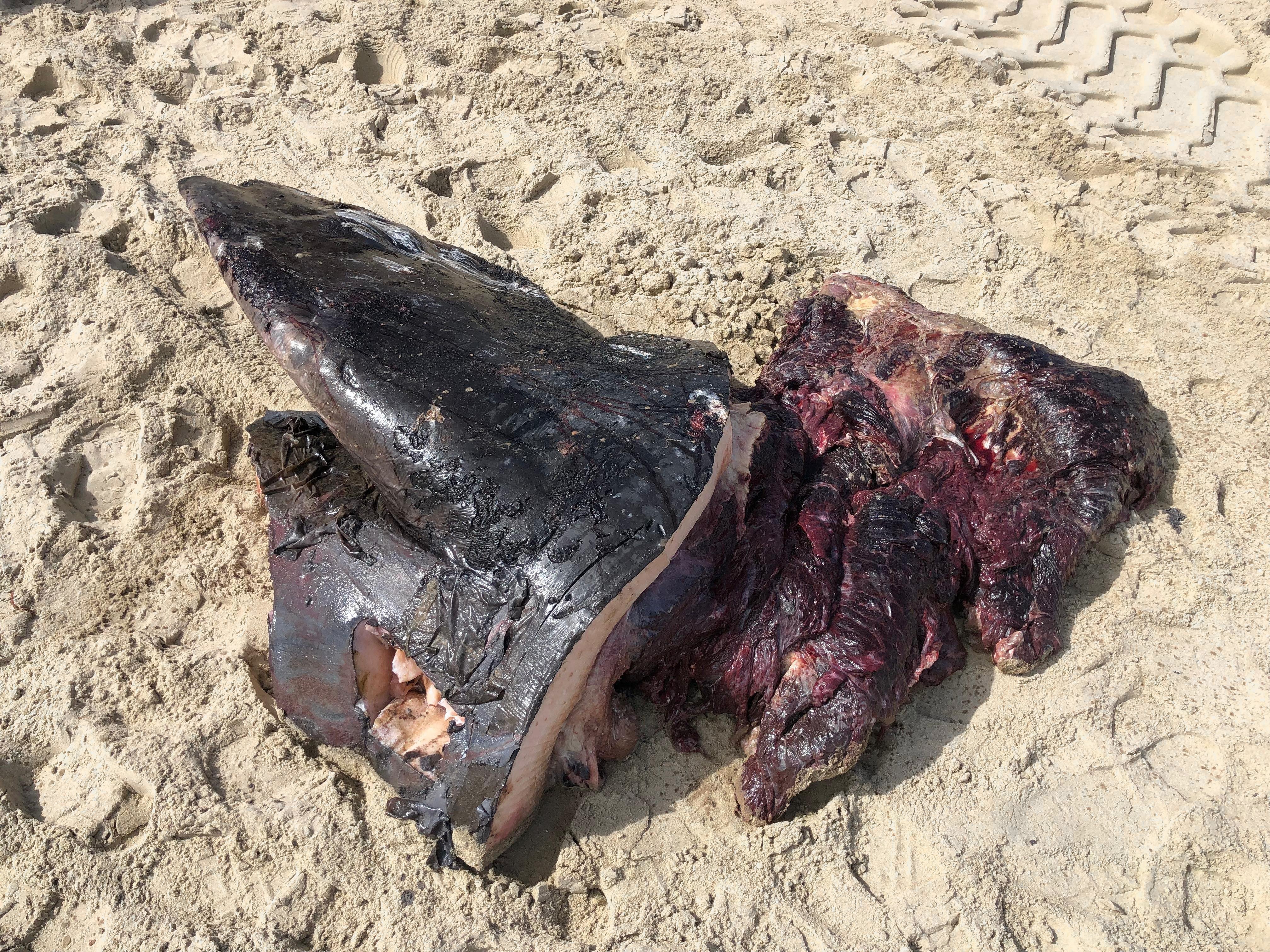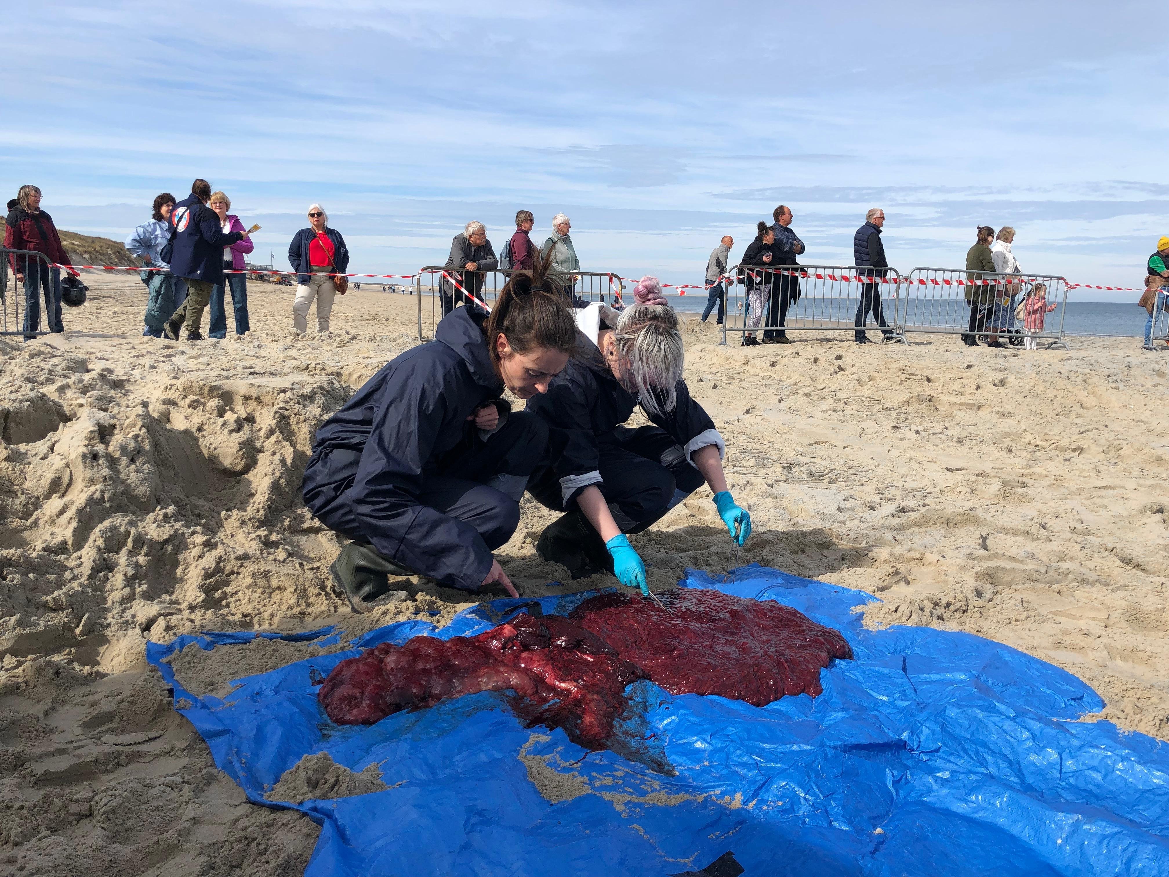 Het ‘onthuiden’ duurt het langst. Een potvis zwemt op twee kilometer diepte, zijn huid is „als een autoband”, zegt IJsseldijk. Vier pathologen zijn dan ook met lange messen in de weer. Laarzen, inclusief tape, verdwijnen in de kluwen darmen op het zand. In blokken van twintig tot dertig kilo tilt de graafmachine de losgesneden blokken aan de kant. Eerst klinken doffe ploffen van de blubber, dan het natte kwakken van de organen.