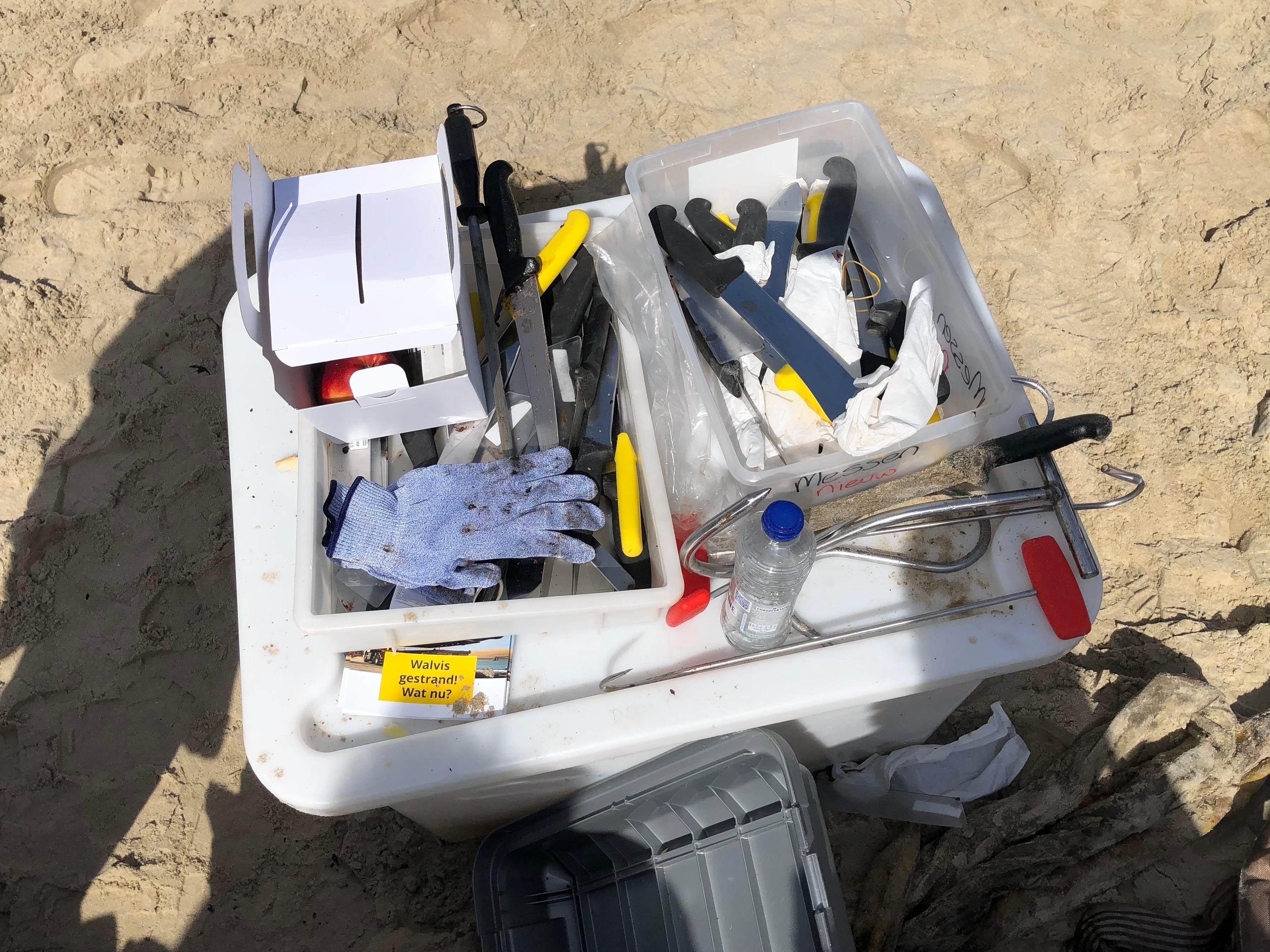 De aanhangwagen van de universiteit, met opschrift ‘Strandingsonderzoek’, klapt open als een viskraam. Daaruit komen lege plastic kisten, een eindeloze hoeveelheid koksmessen en pakken Kleenex. De waterdichte overals gaan in de kaplaarzen, die met duct tape worden dichtgeplakt. Over het geluid van de rupsgraafmachine klinkt het scherpe geluid van messen op aanzetstaal.
