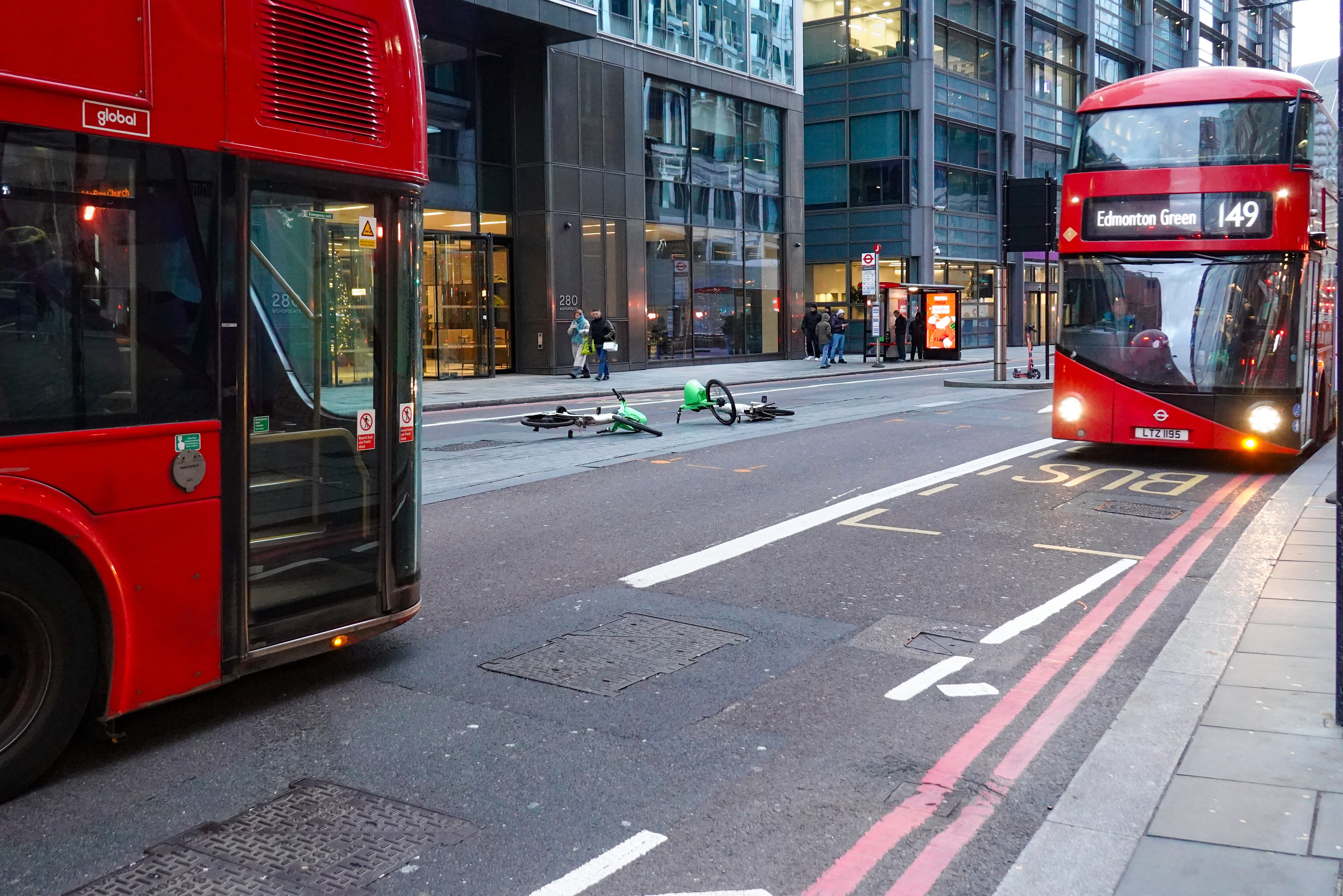 Meteen na de Chiswick-brug over de Theems staan een stuk of tien fietsen van Lime naast de bushalte richting het centrum, in een rij op de stoep. Aan de andere kant van de weg liggen een paar fietsen in de berm. Van eentje is de pedaal kapot, de trapper ligt ernaast in het gras. Onderaan de helling liggen drie fietsen op een hoopje, met hun trappers en sturen in de knoop.