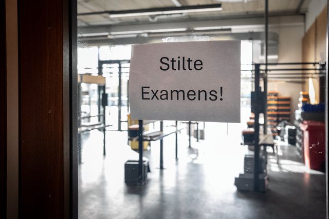 Op het Stedelijk College in Eindhoven worden voorbijgangers tot stilte gemaand: examens!