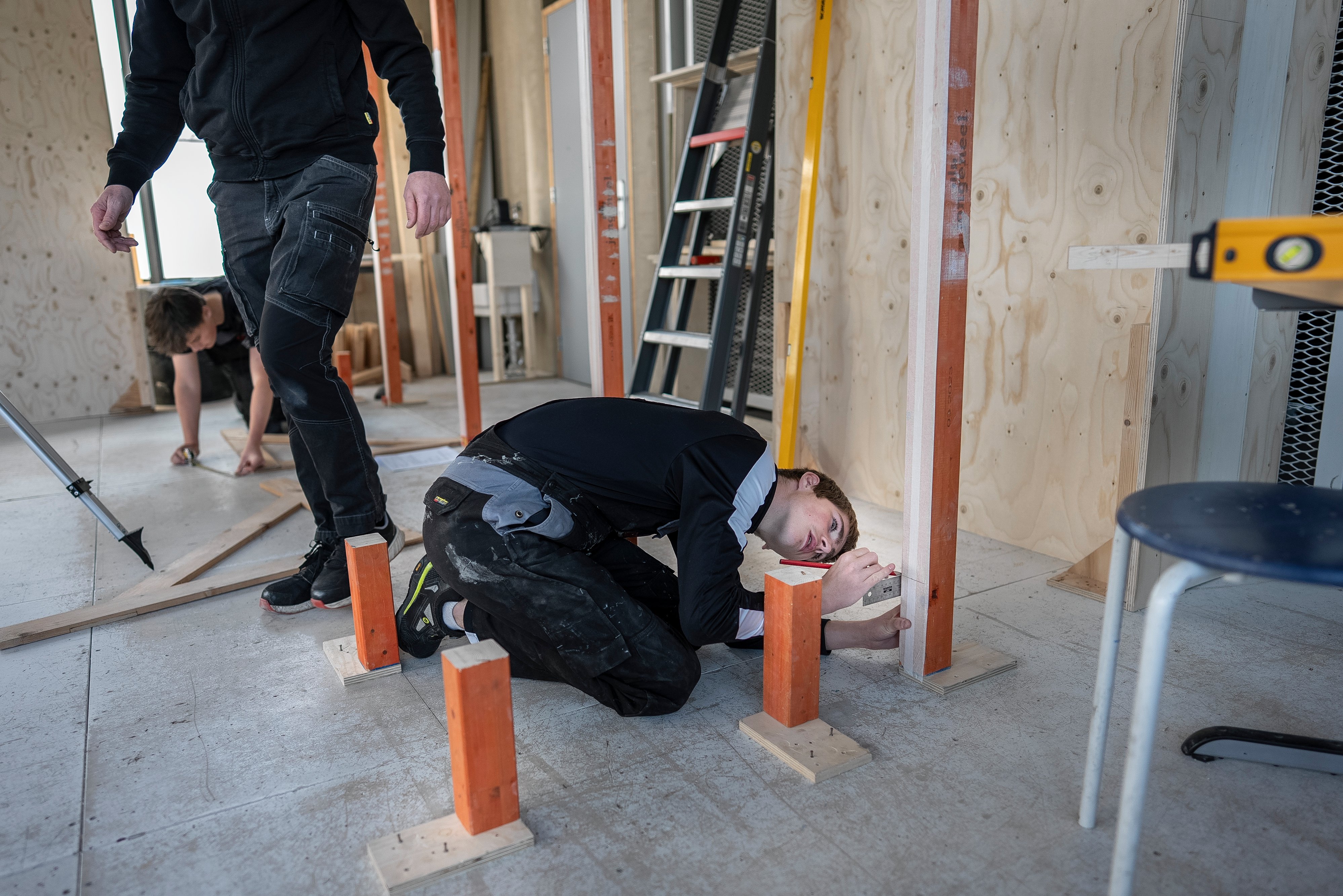 Dat formulier moeten leerlingen aandachtig lezen voor ze beginnen. „Als je één zinnetje overslaat, gaat het verband weg en kun je de opdracht niet goed maken”, zegt Theo van der Maazen, docent en examinator voor bouwen, wonen en interieur. Vier jongens van vijftien en zestien jaar zitten op hun knieën op de betonnen vloer. Ze moeten materiaalberekeningen maken en voorbereidingen treffen voor een bouwwerk. „Ze doen allemaal hetzelfde”, zegt Van der Maazen, „maar elke leerling krijgt een andere maat op.” Zo kan er niet worden afgekeken, want iedereen moet zijn eigen berekening maken, nauwkeurig aftekenen en bouwen.