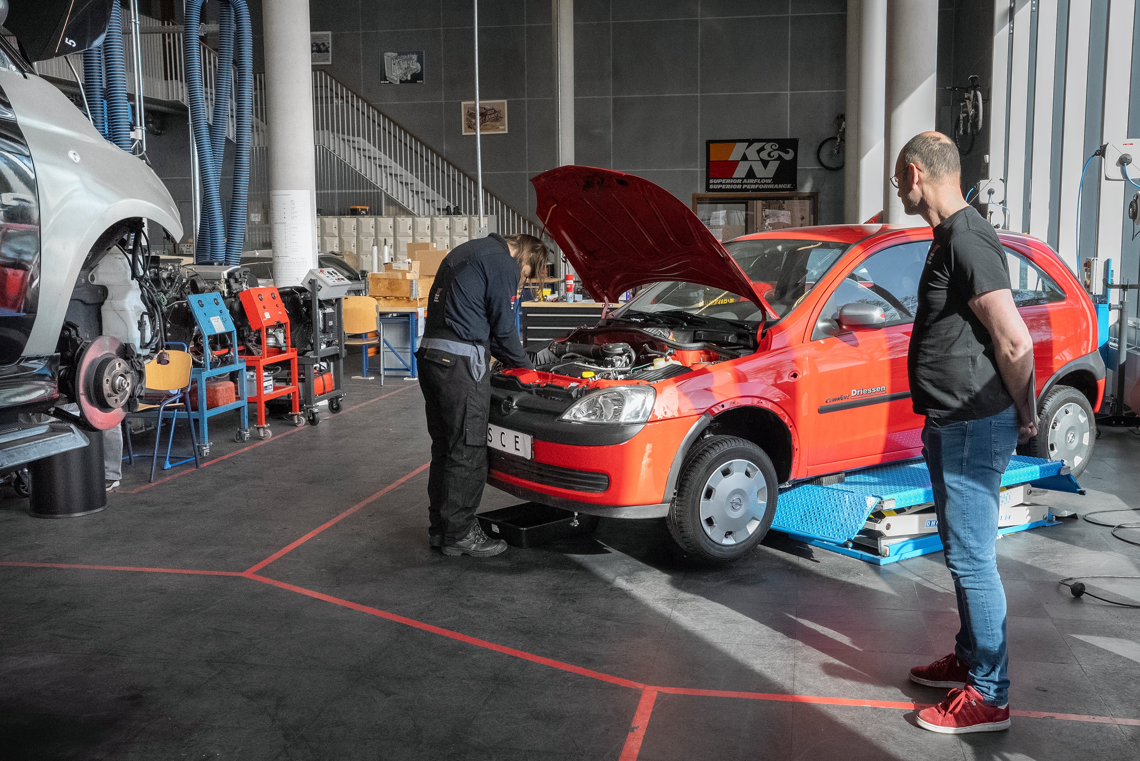 In de werkplaats voor het profiel mobiliteit en transport, die eruitziet als een volwaardige garage, sleutelen leerlingen aan auto’s. Tijdens het examen moeten ze binnen een afgelijnd vak rondom de auto blijven – vanwege de veiligheid en om elkaar niet te storen. Vandaag moeten ze drie opdrachten maken: een defect in de motor repareren, een probleem aan het onderstel verhelpen en een storing in de elektra oplossen.