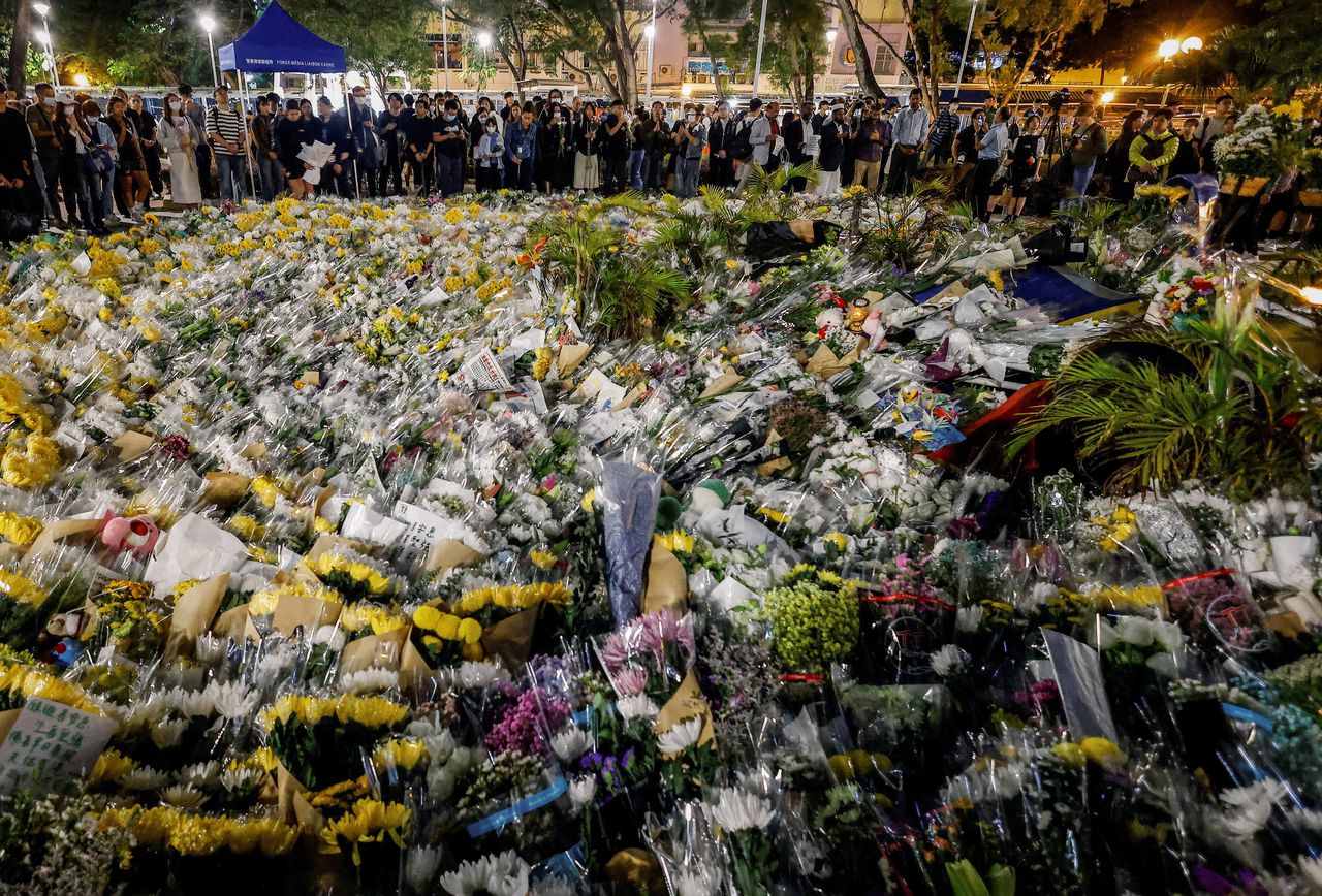 Foto’s Maxim Shemetov/REUTERS; Lam Yik/ReutersZondag werd bekend dat de gedenkplek bij de afgebrande flats, waar een grote bloemenzee is ontstaan, diezelfde avond zal worden ontruimd. Op een aankondiging ter plaatse las een verslaggever van de South China Morning Post dat de herdenking „om middernacht voorbij is”, en dat „ernstige verstoringen” bij de politie zullen worden gemeld.