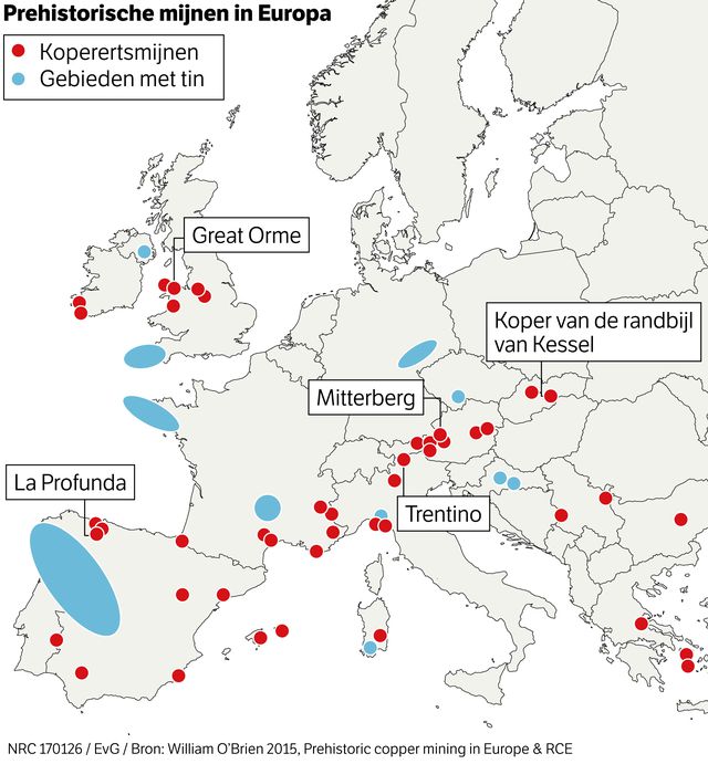 Tussen 1700 en 1400 v.Chr. blijken veel voorwerpen gemaakt van kopererts uit Wales. Theunissen: „In 1987 is bij de aanleg van een parkeerplaats een prehistorische kopermijn ontdekt die nu bekend staat als de Great Orme Mines. Die was enorm productief.” Later in de Midden-Bronstijd kwam het kopererts niet meer uit Wales, maar uit mijnen bij Mitterberg in Oostenrijk en het alpiene gebied in Italië.