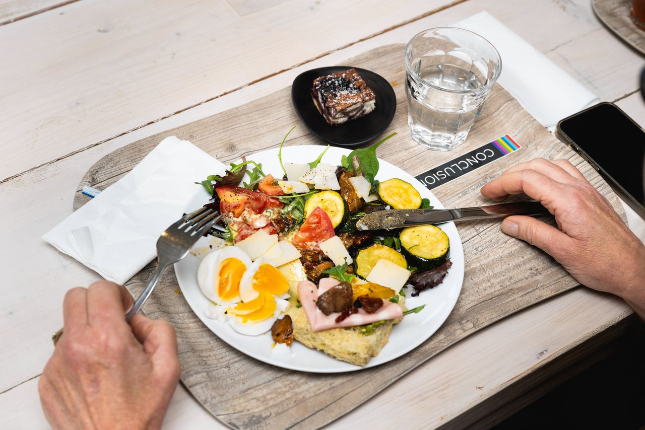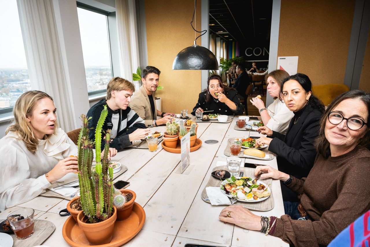 Foto’s Simon LenskensDe kantine, aangekleed als de lounge van een tweesterrenhotel, zit vol. Aan een lange tafel zit de mensen van het marketingteam. We mogen met hen mee lunchen, dat leek hun het leukst. Maarten van Sadelhoff (45) slurpt van zijn Mexicaanse runderbouillon met bospaddenstoelen en legt uit wat Conclusion doet: „Alles op het gebied van businesstransformaties en IT-dienstverlening om onze klanten fullservice te kunnen bedienen.” Er volgen tien minuten met voorbeelden waar het bedrijf allemaal aan werkt. „De darkmode van de stationsborden van de NS, daar hebben wij aan meegewerkt”, zegt Jacqueline van der Laan (57).