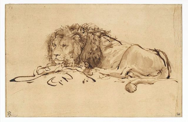 De leeuw die Rembrandt rond 1649 tekende.