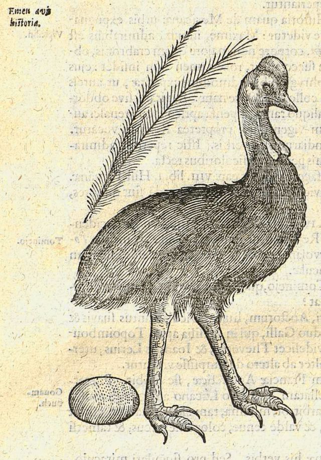Helmkasuaris („een vogel waar je niet echt vriendjes mee wordt”) in het in Leiden uitgegeven ‘Exoticum libri decem’ (1607) van Carolus Clusius.